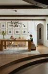 Interior photograph of a round dining space with dark curved banquette and iron chandelier in soft filtered light, shot for a Houston designer's magazine submission
